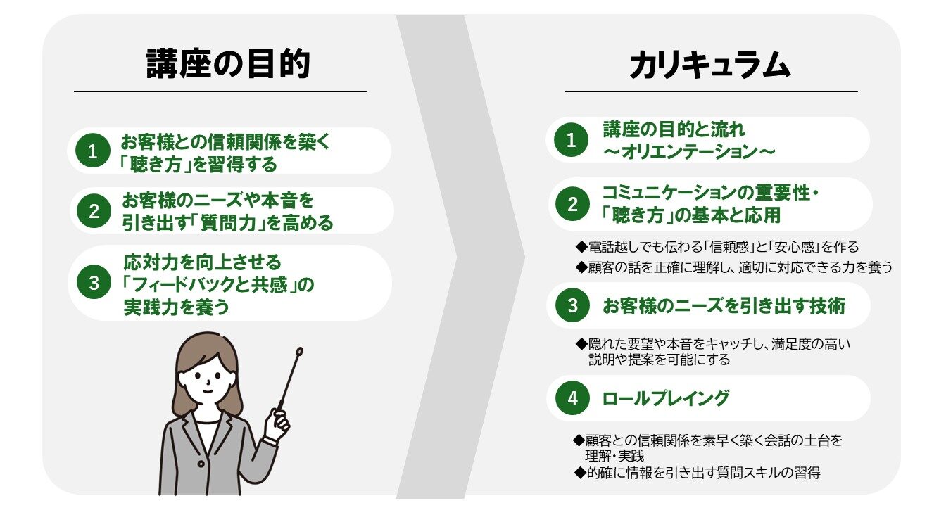 本研修では、電話応対に不可欠なアクティブリスニング(積極的傾聴)を習得し、お客様の“本音”や“真のニーズ”を引き出すスキルを身につけます。