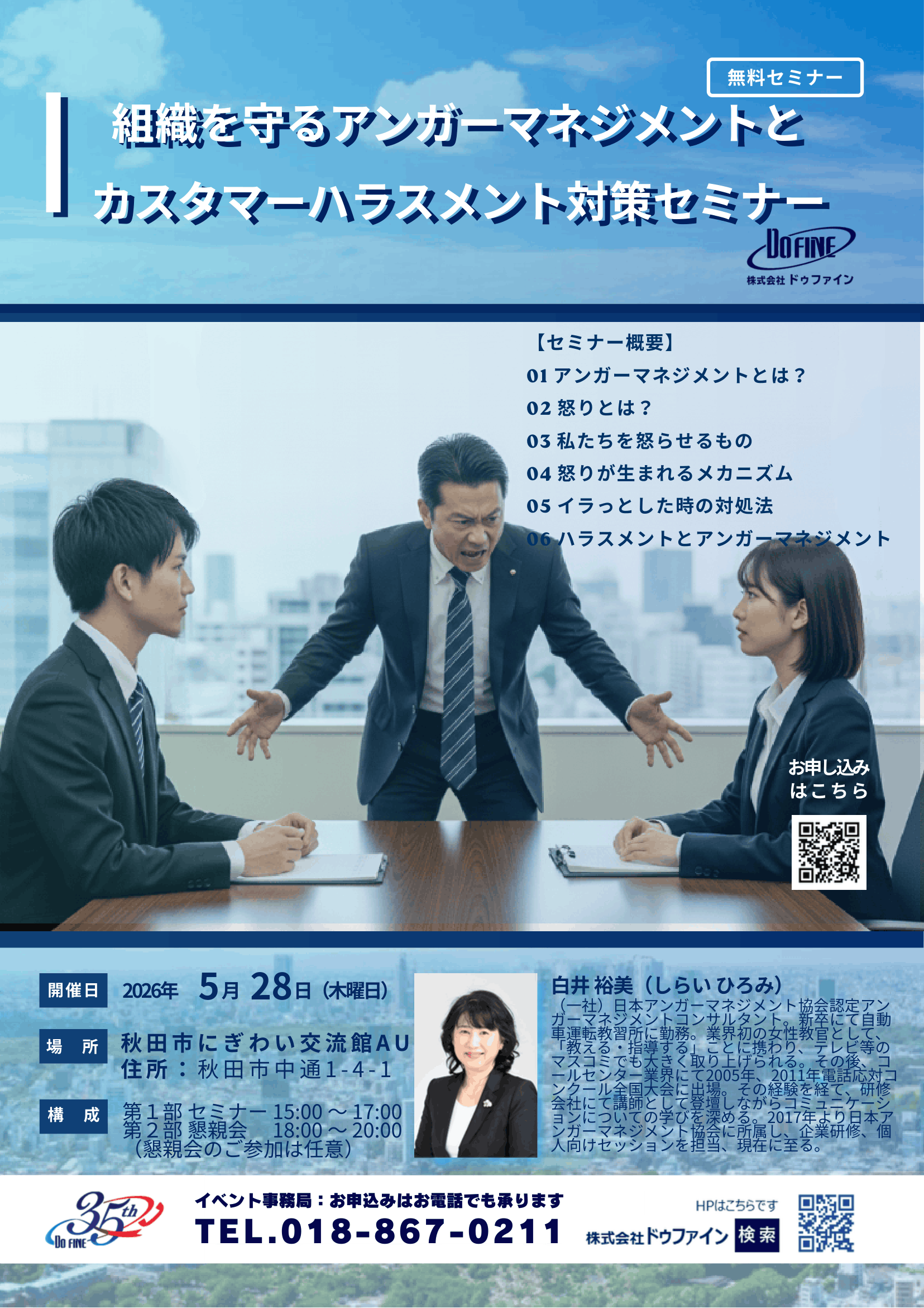本セミナーでは、アンガーマネジメントの考え方を通じて、部下・上司・お客様との良好な関係づくりや、健全な職場コミュニケーションの実現につながるポイントをわかりやすくお伝えいたします。