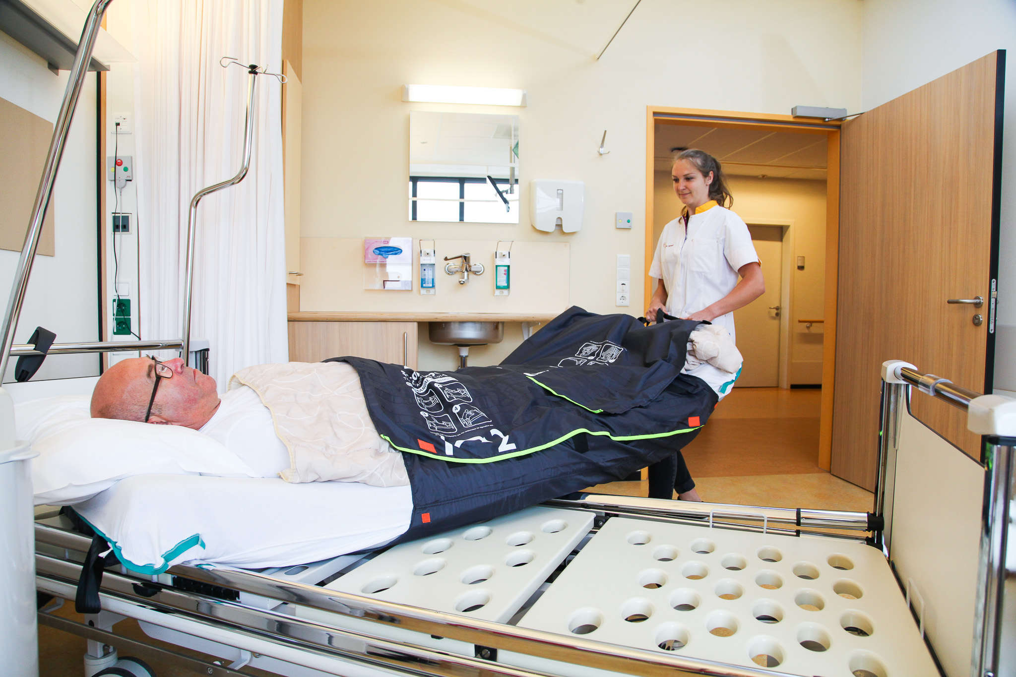 ベッド下に常設でき、移乗不要でマットレスごと包み込んで避難できるベッド一体型モデルです。